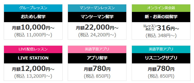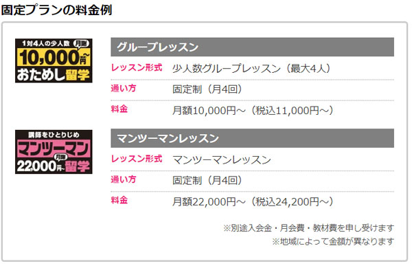 月謝制がメイン。大手英会話スクールの中では比較的安価な料金設定。入会金は不要。(テキスト代などは別途必要)。