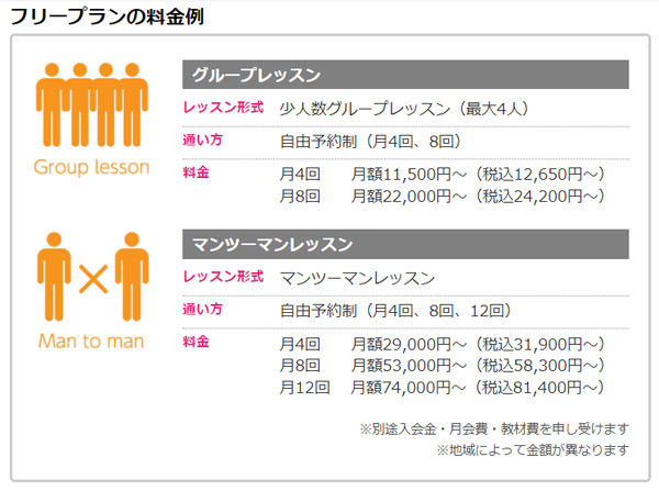 - グループレッスンは月額11,000円〜、マンツーマンは24,440円〜と比較的リーズナブル